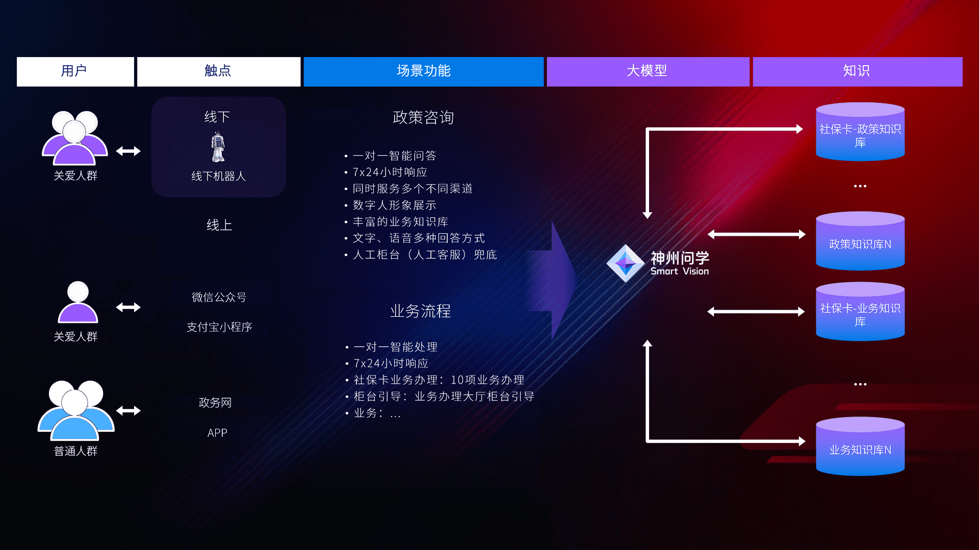 • 利用大语言模型+RAG技术,,,,支持多轮对话,,,可识别多种同义词、、、、近义词,,,精准理解关爱人群语义快速输出结果。。。。