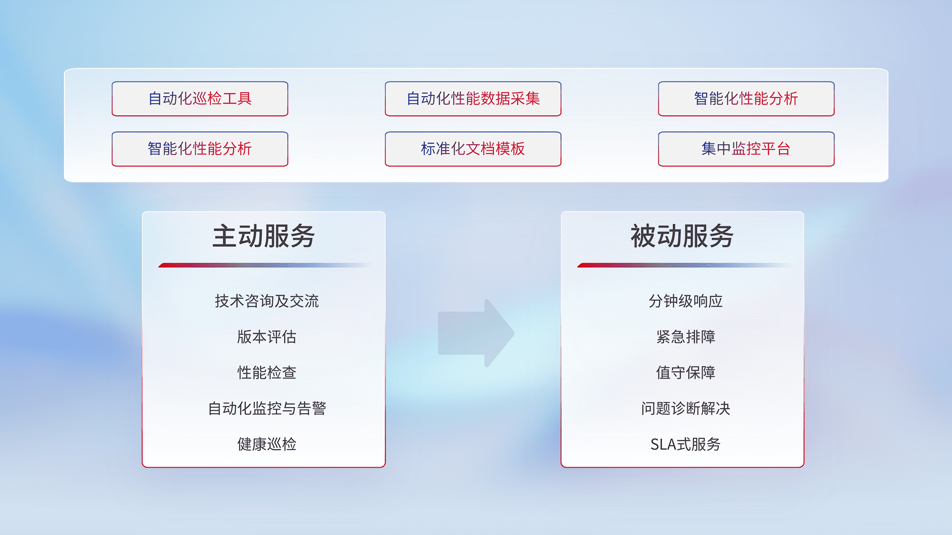 智能化工具和标准化文档,,,保障服务质量,,,提供主动服务(包含技术咨询、、版本评估、、、、性能检查、、、自动化监控与告警、、、、健康巡检)和被动服务包含(分钟级响应、、紧急排障、、、值守保障、、问题诊断解决、、、SLA服务)。。